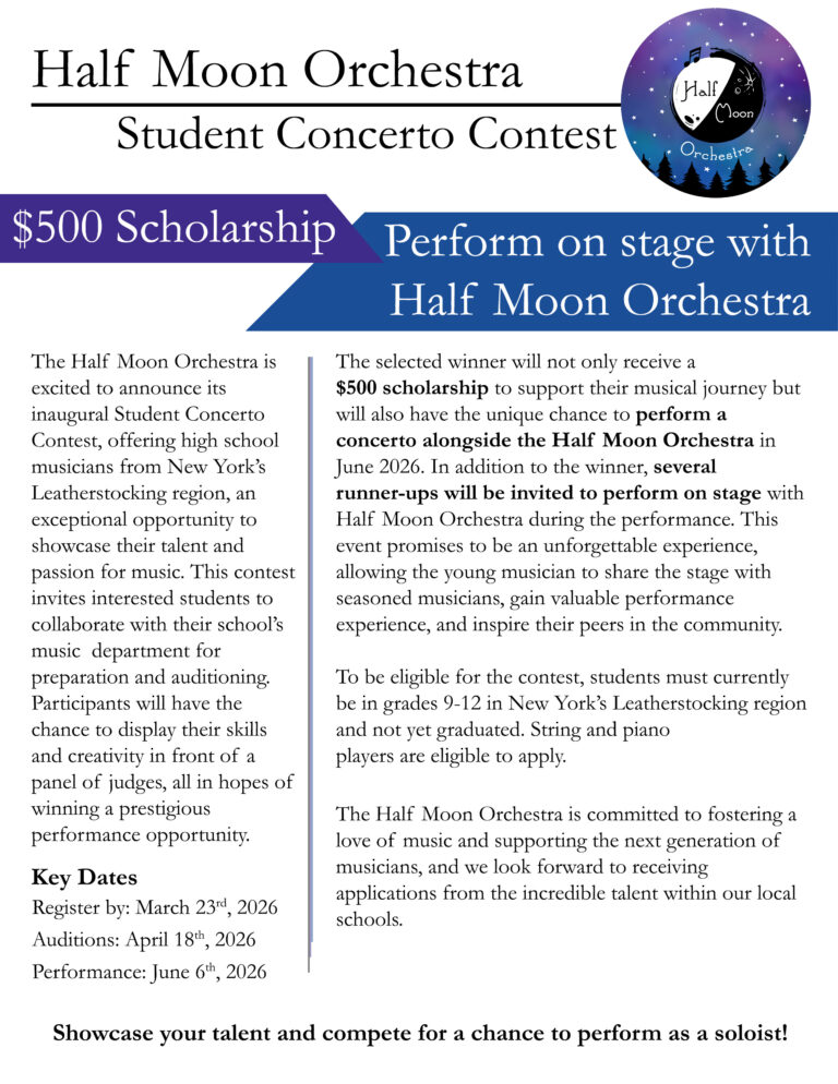 The Half Moon Orchestra is a community chamber ensemble founded in 2022. Sponsored by Fiber Instrument Sales, the group operates out of Oriskany, NY.